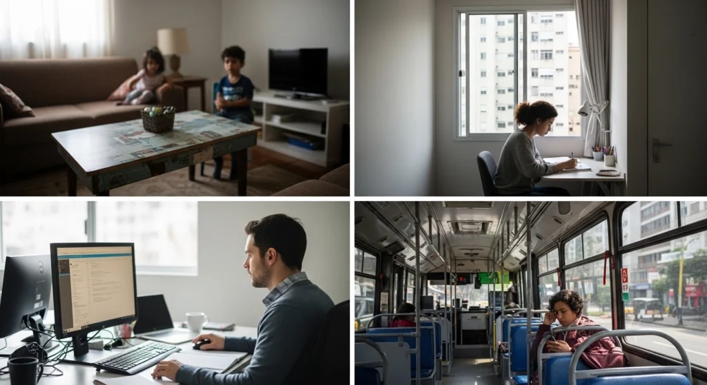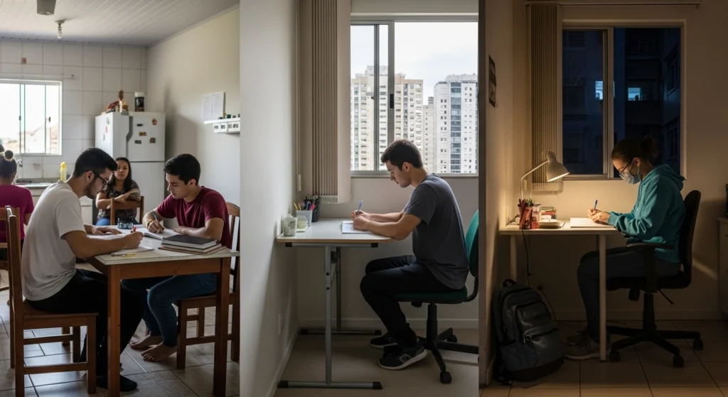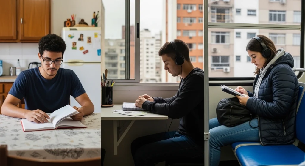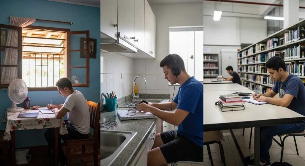 Troque a exigência de silêncio pela regra de “não me chamar” durante o bloco. Use fones, escolha conteúdos que exigem menos leitura em dias mais agitados e planeje revisões em horários naturalmente mais calmos.
