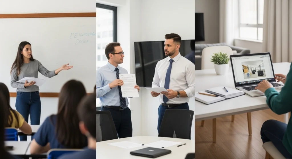 A imagem retrata como a apresentação muda conforme o contexto no Brasil. No ambiente escolar, o foco está na explicação clara do conteúdo. No cenário corporativo, a ênfase está em resultados e decisões. Já no home office, a atenção se volta para organização, clareza na fala e adaptação ao formato online. A composição destaca que a preparação precisa considerar o público e o ambiente em que a comunicação acontece.