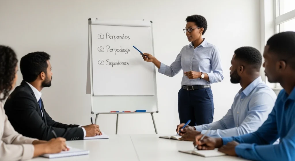 A imagem mostra o momento em que a apresentação está claramente orientada para um objetivo. A apresentadora aponta para três ideias principais no quadro, enquanto o público acompanha atento e faz anotações. A cena transmite foco, organização e clareza sobre o que precisa ser entregue ao final da fala: uma mensagem central compreendida e aplicável.
